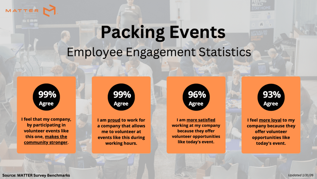 MATTERbox packing events events don’t just strengthen communities, they strengthen cultures. And the data from our packing survey benchmarks (above) show real impact for those organizations who take part.